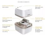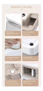 Outro destaque é o design vedado, que evita vazamentos e odores desagradáveis. O vaso ainda conta com alça ergonômica para facilitar o transporte, cotovelo giratório de 270° para despejo mais limpo e botão de alívio de pressão, que elimina respingos ao esvaziar. Para completar, o assento e a tampa são removíveis, o que facilita a higienização após o uso.